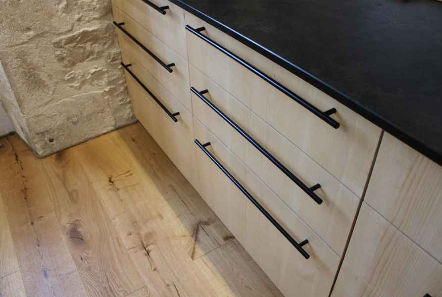 Conception de l'ensemble des éléments : plan de travail, chariot, casier, desserte, placard, rangement, bar, mange-debout, range bouteilles, tiroirs sur mesure...